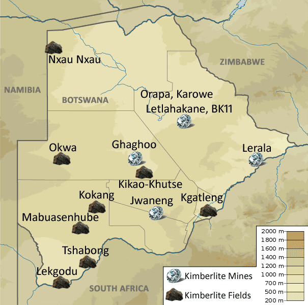 Jwaneng Diamond Mine, al sur de Botswana, es la mina con más valor del mundo. En la mina de Karowe, se encontró el diamante más grande del mundo (1000 kilates y un tamaño de 65x65x40). (Mining).