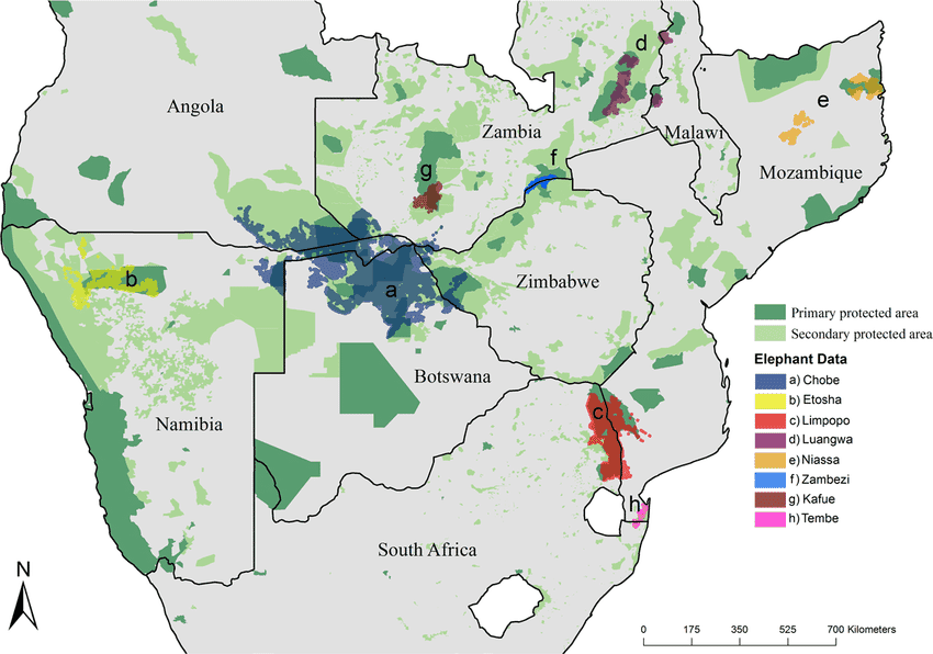 Botsuana es el país con la mayor cantidad de elefantes del mundo. Se calcula que hay una población de 140.000 en el territorio. Este mapa muestra la distribución de elefantes en el África del Sur. (Research Gate)