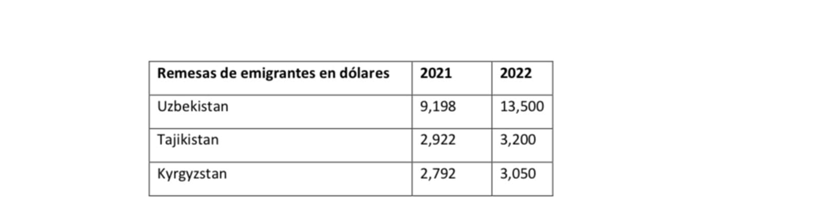 En esta imagen se muestra cómo el incremento de las remesas que los centroasiáticos trajeron a sus países incrementó en 2022 con respecto a 2021 a pesar del comienzo de la guerra en Ucrania. Fuente: Knomad