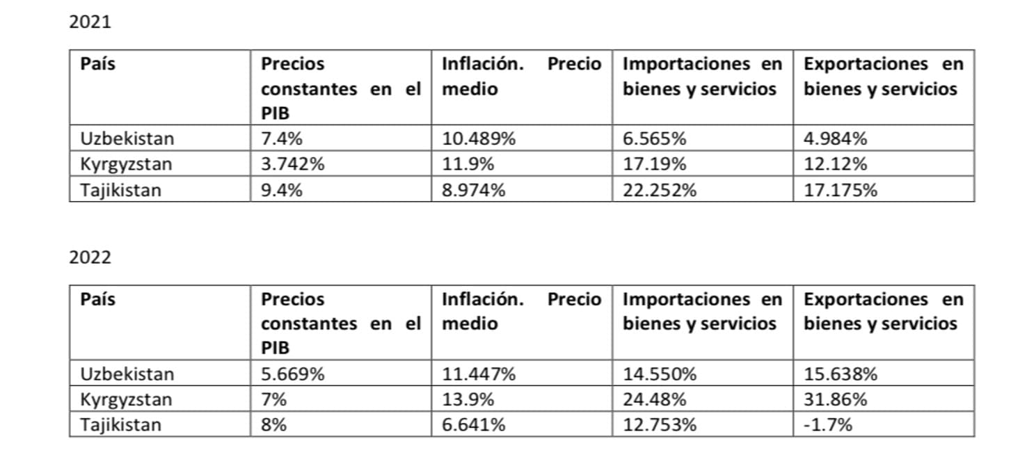 En esta tabla se muestra que el impacto más negativo que se vio en Asia Central en 2022 tras el comienzo de la Guerra de Ucrania fue en la inflación. El resto de ítems no se vieron negativamente afectados. Datos del Fondo Monetario Internacional (IMF)