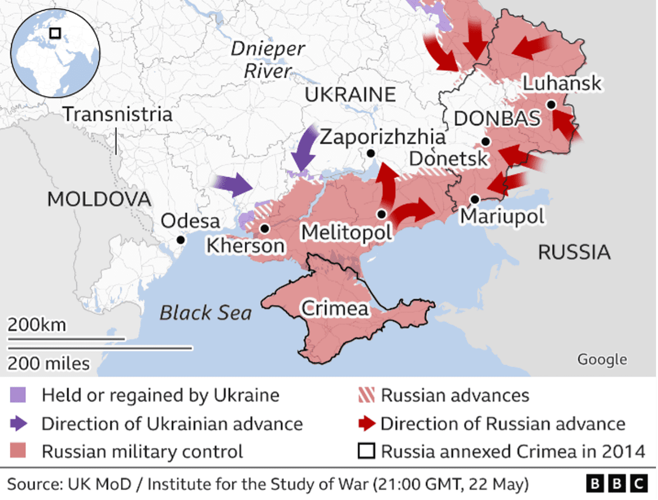 Mapa de las ciudades ocupadas en Ucrania donde los emigrantes centroasiáticos trabajan para compañías rusas privadas. (BBC)
